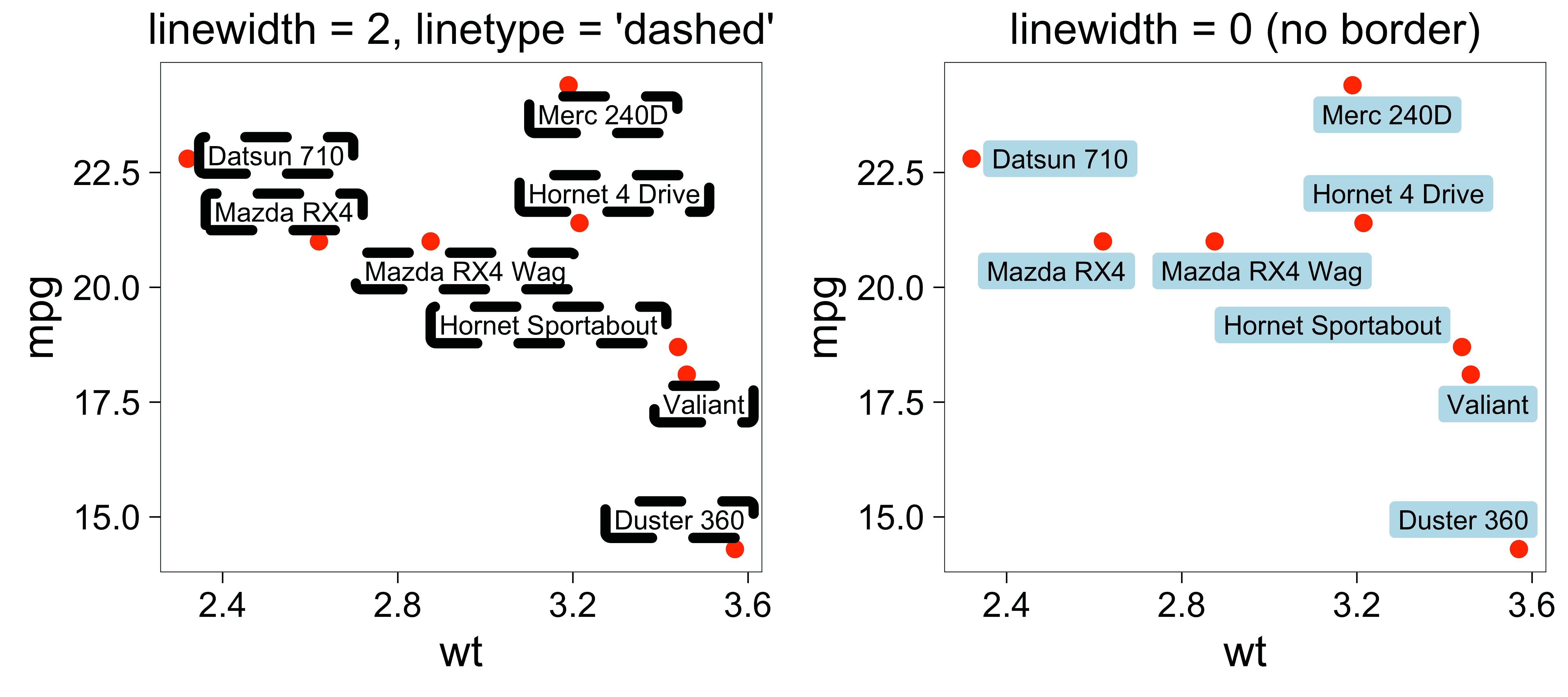 p <- ggplot(dat, aes(wt, mpg, label = car)) +